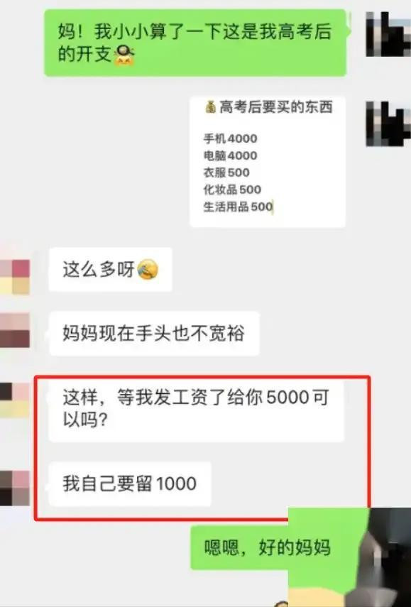 女孩高考后列了个清单,想买手机、衣服、电脑、化妆品、手机壳,总共一万多。她满心期待地向妈妈提出要求,结果妈妈却说家里实在拿不出那么多钱,最后只能同意买个手机。