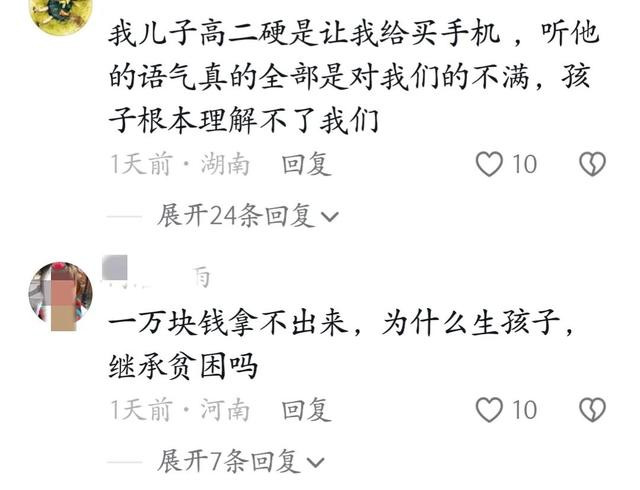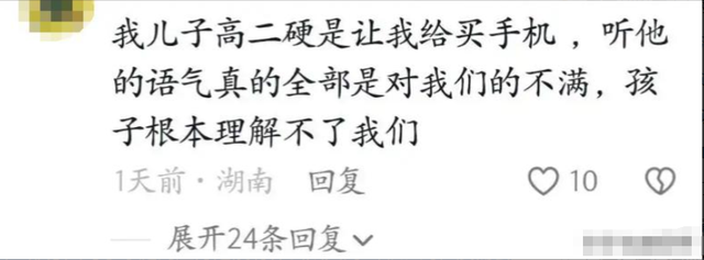 也有一些父母分享了类似的经历。有位父母说,孩子上高二时也让他们买手机,但孩子的一番话里满是对父母的不满,根本不理解父母的难处。